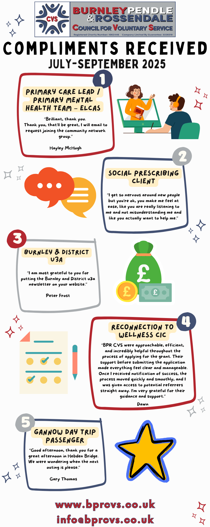 If you'd like to know about the impact BPRCVS has upon the communities of Burnley, Pendle, Rossendale, and even further afield, our overall quarterly impact report pulls everything together in one comprehensive report which includes the statistics displayed in these Pendle materials alongside the other localities we cover, but additionally this report also contains a range of case studies and comments to further demonstrate our impact. Visit Our Impact page to watch a video version and download the latest report (we also have back copies available too).