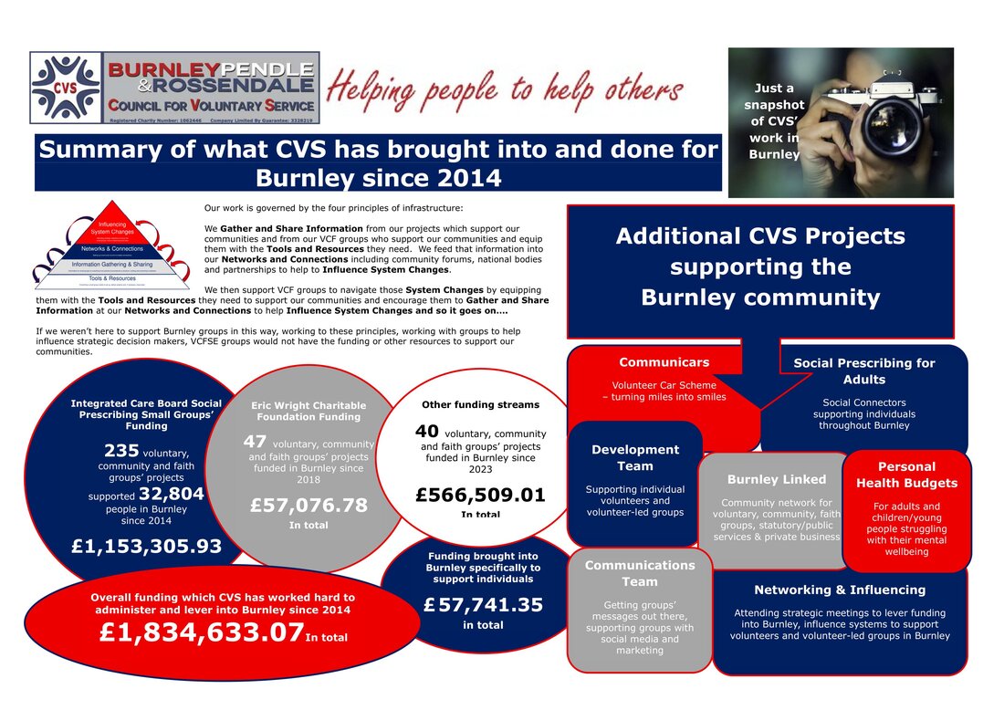 BPRCVS and Burnley Borough Council have had a beneficial, strong and fruitful partnership over many years. The Service Level Agreements that have been in place have dictated the work CVS delivers in Burnley. CVS projects, connections and partnerships enable us to bring huge added value to enhance the funding from Burnley Borough Council and exceed expected delivery. The work CVS does outside of the Service Level Agreement enables more funding to be brought into Burnley. This enhances not only the voluntary, community and faith sector landscape but also the economic landscape of Burnley.