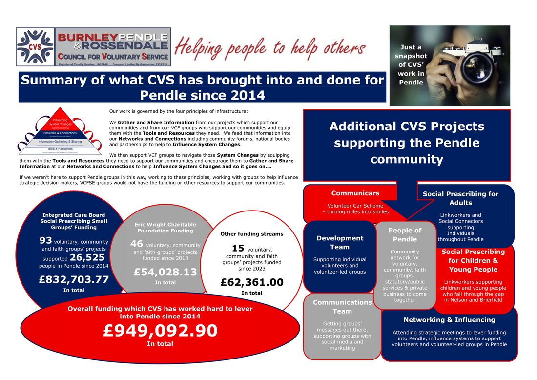BPRCVS and Pendle Borough Council have had a beneficial and fruitful partnership over many years. The Service Level Agreements that have been in place have dictated the work CVS delivers in Pendle. CVS projects, connections and partnerships enable us to bring huge added value to enhance the funding from Pendle Borough Council and exceed expected delivery. The work CVS does outside of the Service Level Agreement enables more funding to be brought into Pendle. This enhances not only the voluntary, community and faith sector landscape but also the economic landscape of Pendle.