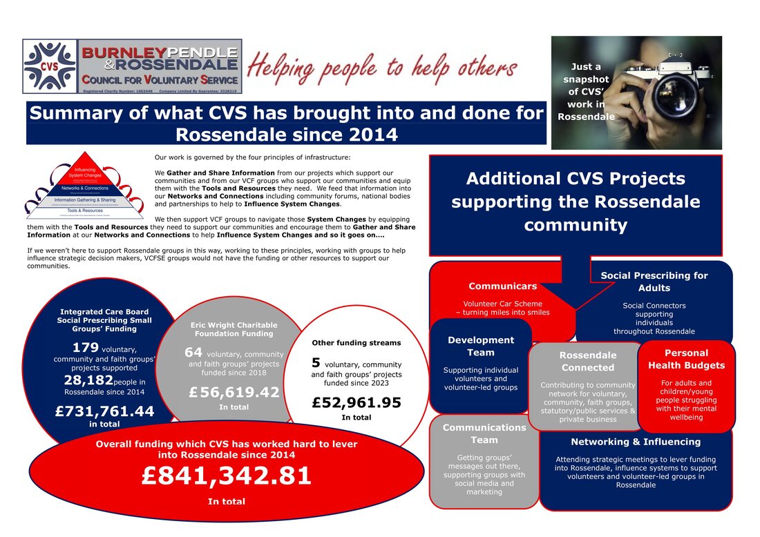 BPRCVS and Rossendale Borough Council have had a beneficial partnership over many years. Although the partnership has not had a Service Level Agreement in place for a number of years, CVS continues to deliver vital services in the Rossendale community. The work CVS does enables more funding to be brought into Rossendale. This enhances not only the voluntary, community and faith sector landscape but also the economic landscape of Rossendale.