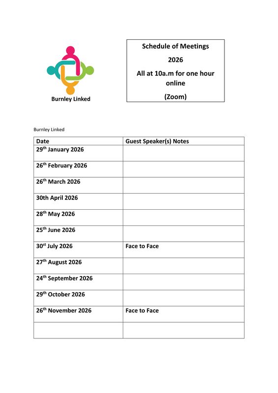 Burnley Linked meets on the last Thursday of every month at 10 a.m. The meeting takes place online via Zoom. Each meeting provides VCFSE groups and organisations an opportunity to share information and discover new projects and services. Occasionally the network has a guest speaker with a particular focus. The meeting link will be sent to registered network members a few days prior to each meeting.