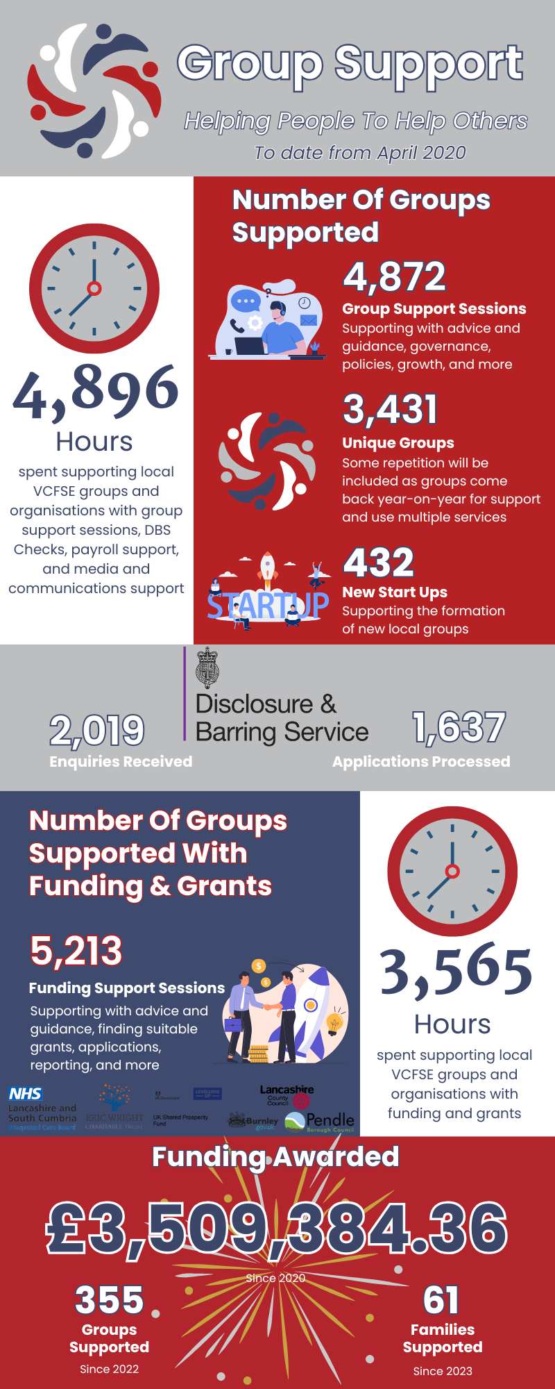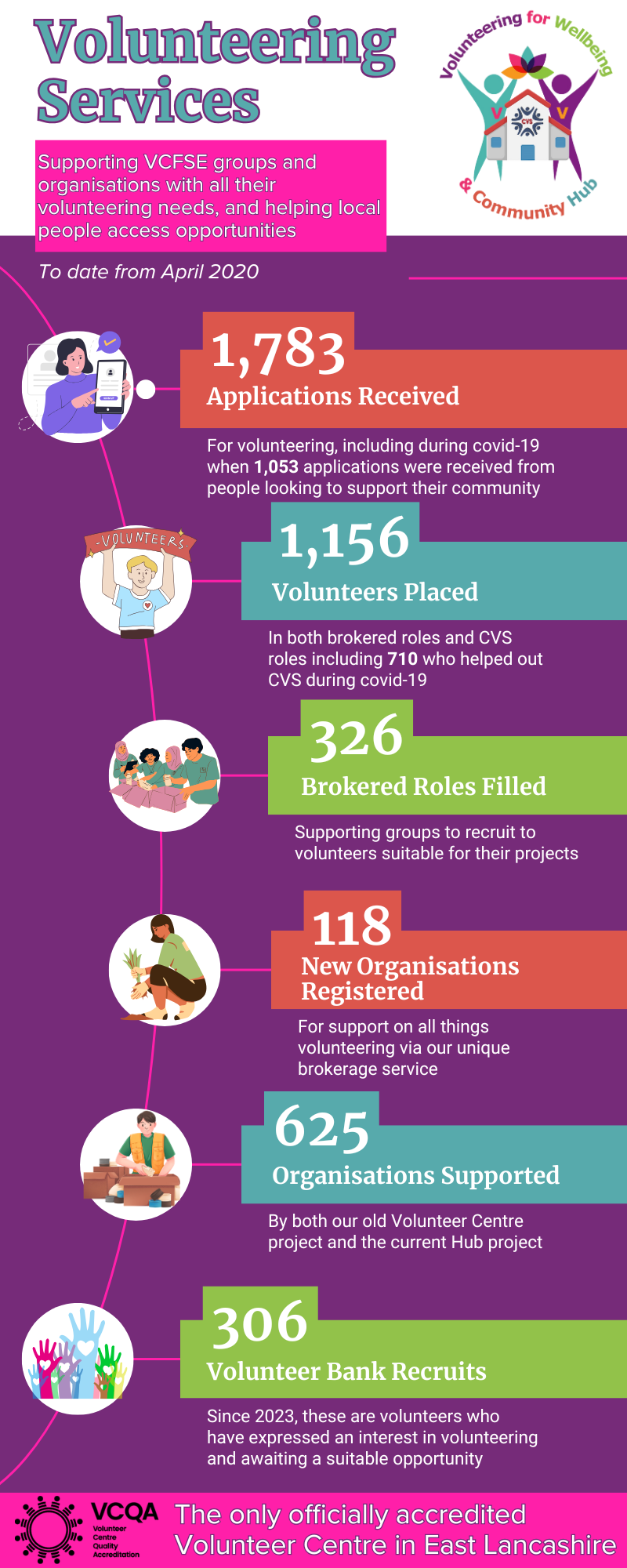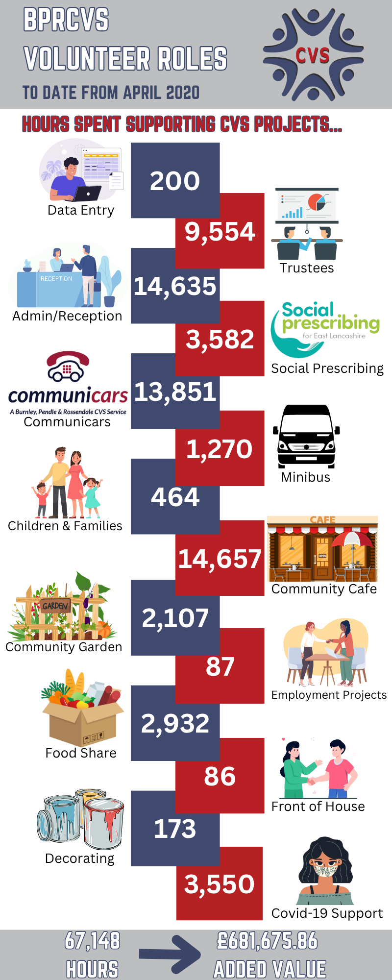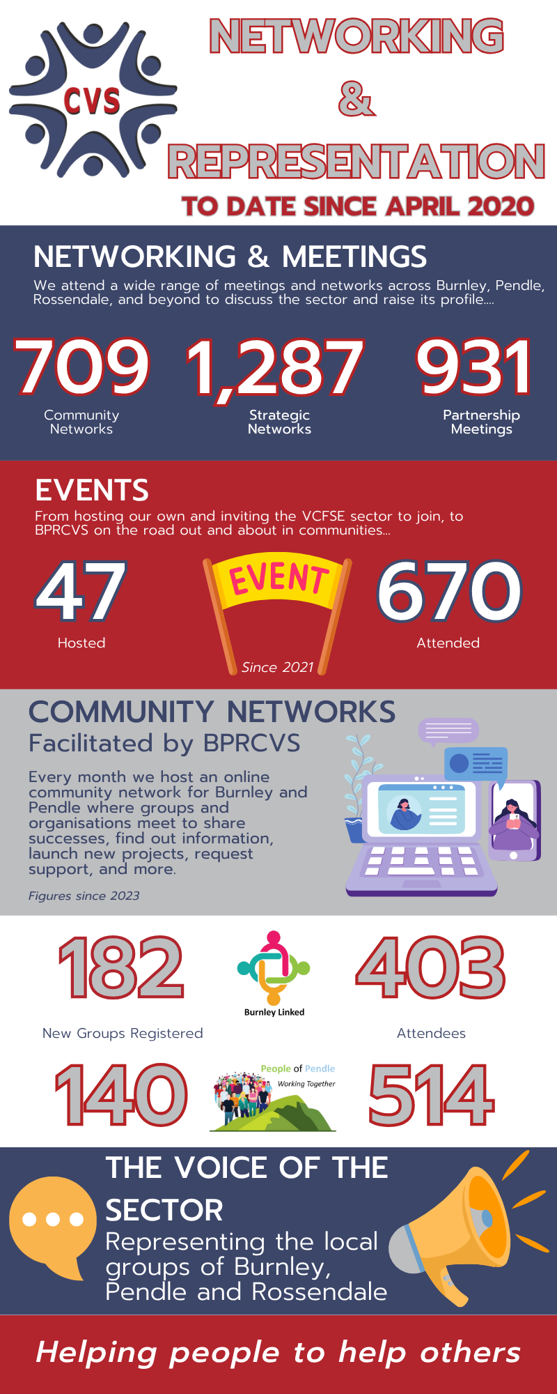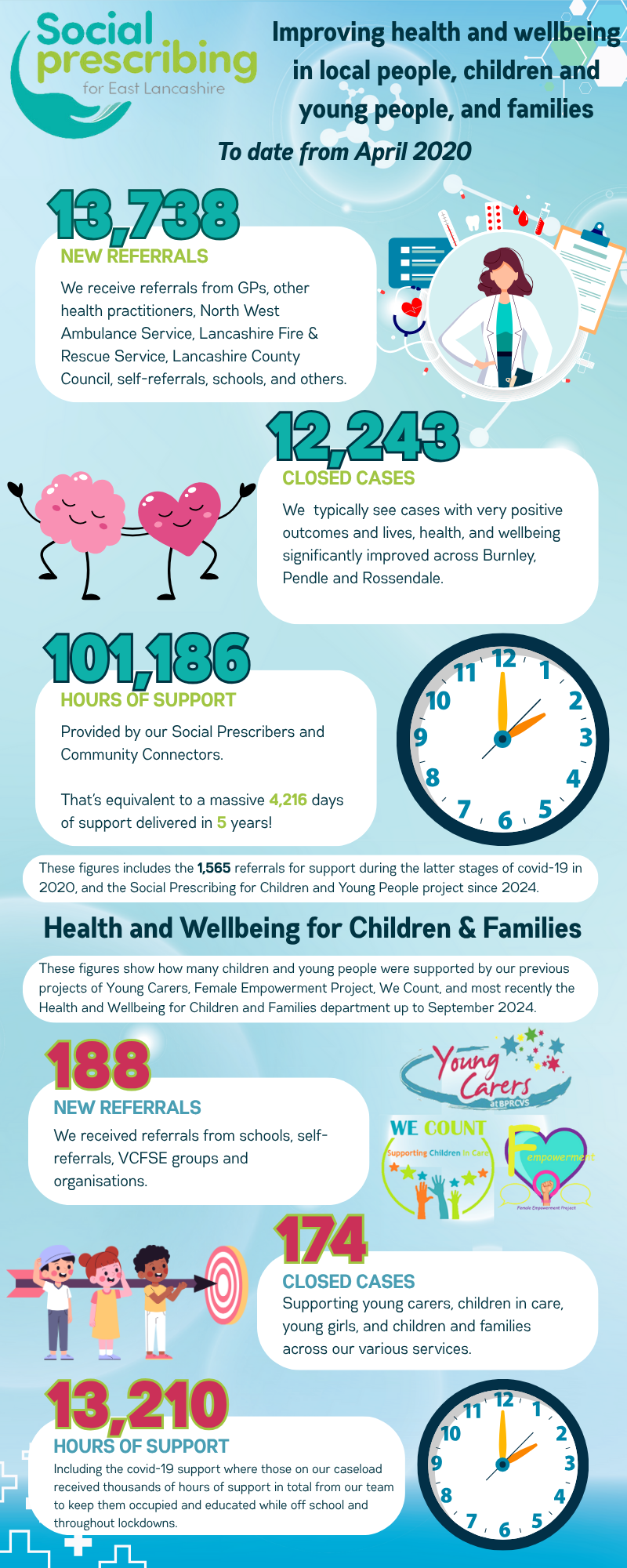 The infographics below are a cumulative of our impact across Burnley, Pendle and Rossendale across our core projects and services from April 2020 to date (last updated October 2025). Click on the infographics to enlarge.